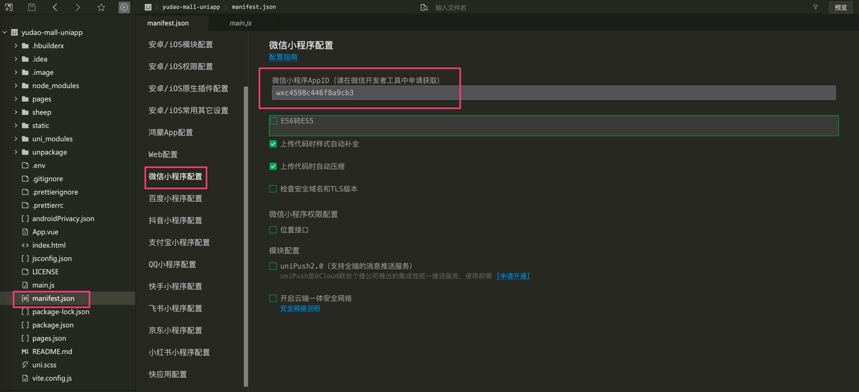 ② 在 HBuilder 中,选择项目根目录的 manifest.json 文件,选择「微信小程序」配置,填写你的微信小程序 AppID。如下图所示: